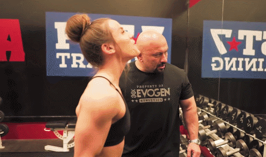 这个动作同样使用龙门架和绳索进行训练,2.5KG的重量配合背向俯身的动作,将绳索放在脑后,由后至前进行臂屈伸拉动。